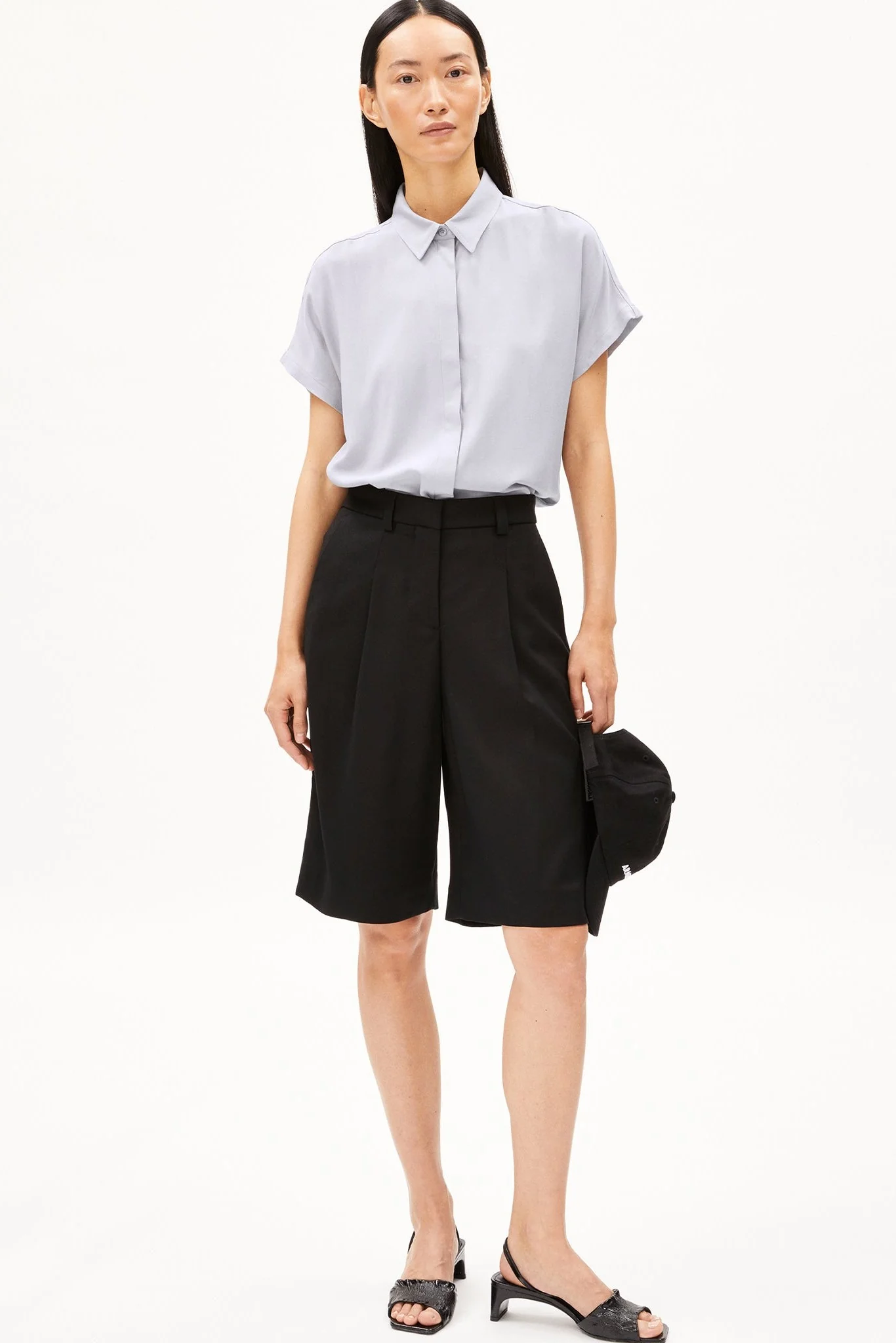 Die Larisaana Bluse von Armedangels ist ein minimalistisches Must-have, das Eleganz und Nachhaltigkeit verbindet. Hergestellt aus 100 % Lenzing™ Ecovero™ Viskose, überzeugt die Bluse durch ihren weichen, fließenden Stoff und eine umweltfreundliche Produktion. Der Relaxed Fit sorgt für eine lässige Silhouette und hohen Tragekomfort. Der Rundhalsausschnitt in Kombination mit einem klassischen Hemdkragen verleiht der einfarbigen Bluse eine zeitlose Ausstrahlung. Die kurzen Ärmel machen sie perfekt für wärmere Tage oder zum Layering an kühleren Abenden. Ob im Büro oder in der Freizeit – die Larisaana Bluse passt sich jedem Anlass an. Dieses Kleidungsstück steht für Qualität und faire Produktionsbedingungen. Als PETA-zertifiziert vegan ist die Bluse frei von tierischen Bestandteilen – ideal für bewusste Modefans.